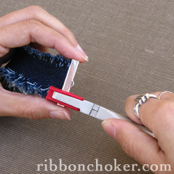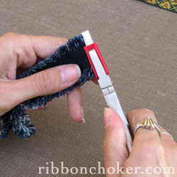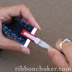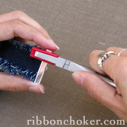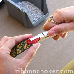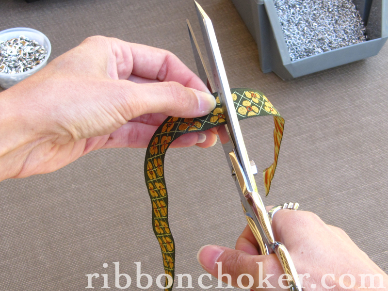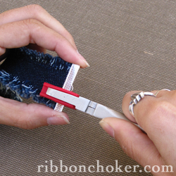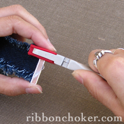As for tools, sharp fabric scissors work the best on ribbon. But you probably already knew that... Just be sure to cut the ribbon at a straight perpendicular angle so that the clamp will easily sit against it without being crooked.