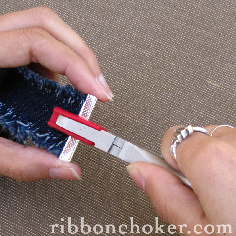 Once it's closed, I place it flat in my pliers, press, flip it over and press again to make sure it's good and tight and the ribbon's not going to slide out.