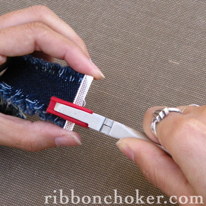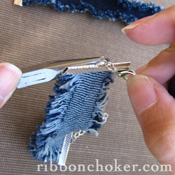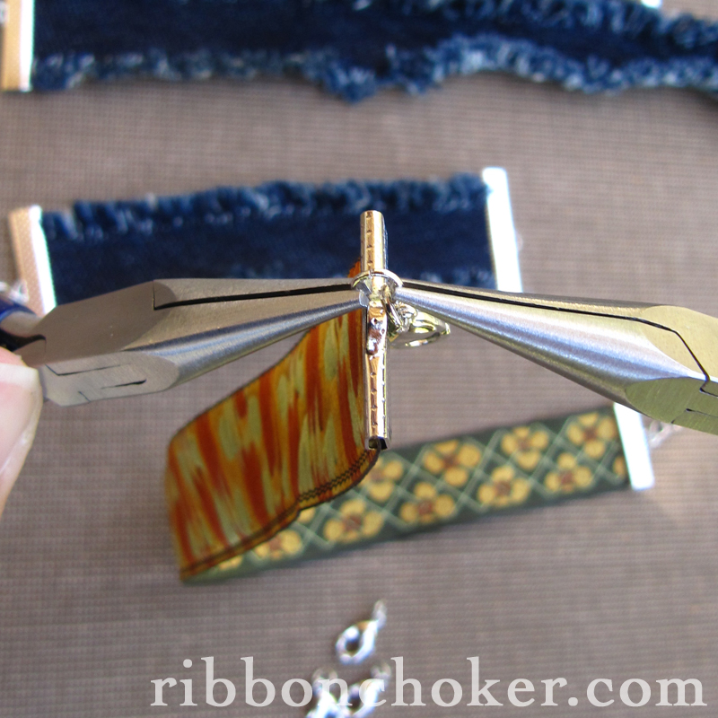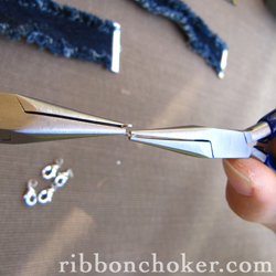 Okay, open the other jump ring. Thread it through the loop on the other ribbon clamp. When you put the clasp on, the lever should be facing the front of the ribbon or the hook should be facing the back of the ribbon. If you're using double-sided ribbon or lace, it doesn't matter which side the hook or lever faces. Close the jump ring.