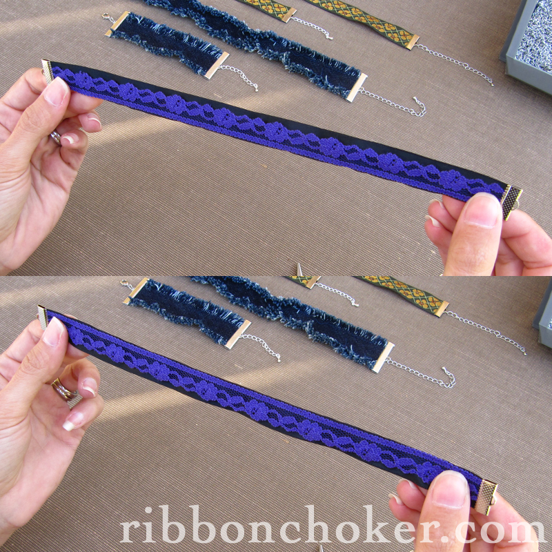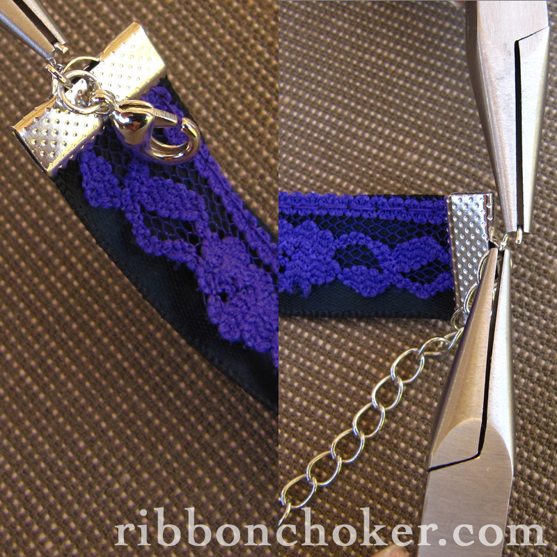 If your ribbon needs to hang in a certain direction, be aware which side needs the clasp and which side needs the chain. I like to hold it up in front of me. If you're using a simple satin or non-scalloped lace, it doesn't matter which side is which. If you're using a scalloped lace (only scalloped on one side) or a ribbon with a pattern that has a top and bottom such as words embroidered or printed on it and you're right handed like I am, the scallop or bottom of the pattern should be on the lower edge, front side up, chain goes on the right hand side, clasp on the left so that when you put the choker on, the clasp is in your right hand. Lefties should put the chain on the left and the clasp on the right.