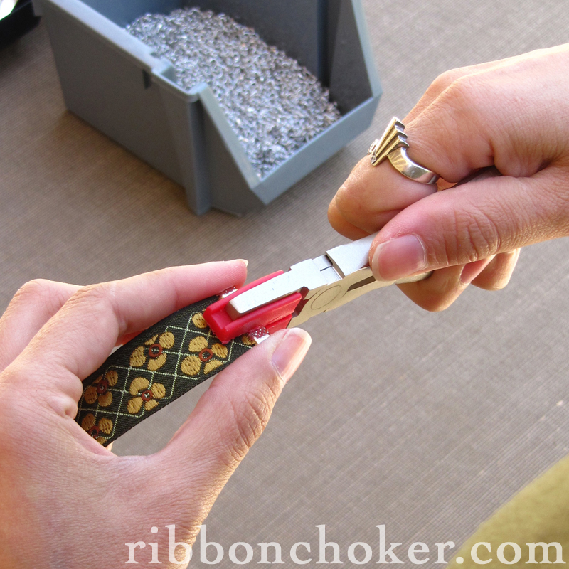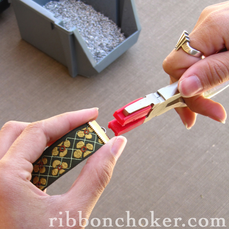 Being right handed, I have the pliers in my right hand, place the clamp in the jaws, add the ribbon with my left hand and sort of hold it all steady while I close the clamp. Sometimes I get my fingers caught in the clamps. It's only a momentary ouch and has yet to leave a mark, but I figured I might pass along the friendly warning. I obviously try not to crimp my fingers, but sometimes it's unavoidable.