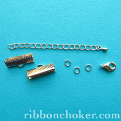 Ribbon clamps are what hold the ribbon in place. They come in many different sizes. I have a selection of ribbon clamps available in my shop in case you need some. I also carry complete ribbon jewelry finding hardware kits which include everything but the ribbon.